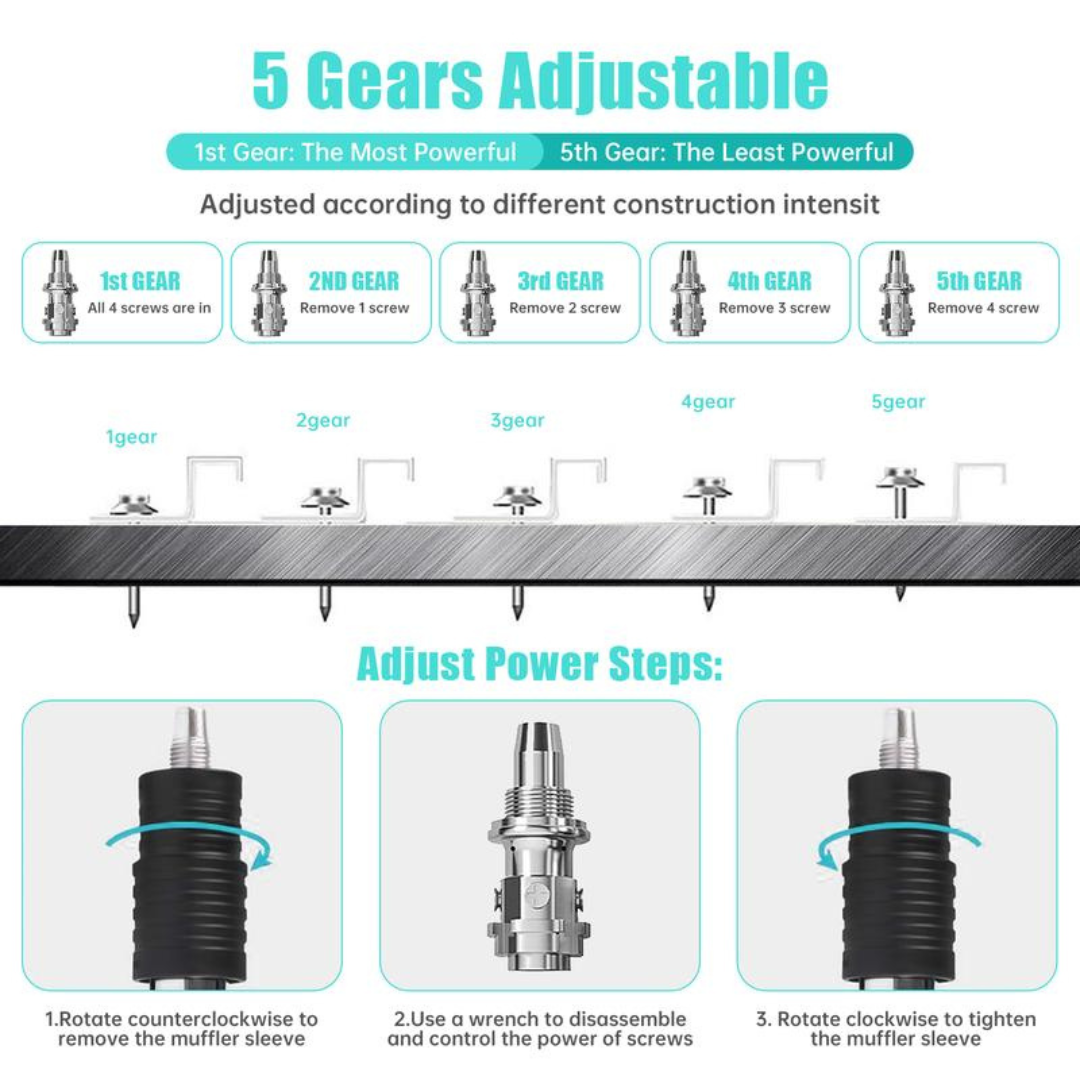 Five precise speed levels let you match penetration power to material density and nail length for controlled, accurate fastening every time.